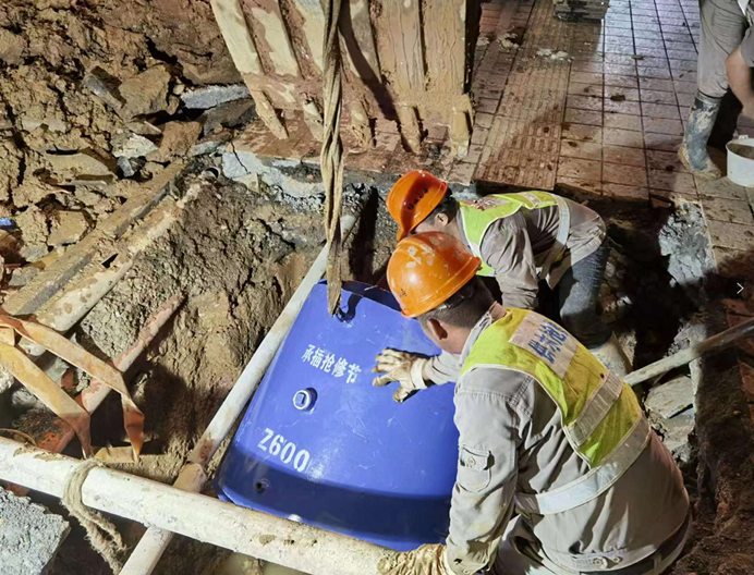 (淩晨時刻,搶修人員正在爲破損水管安裝哈夫搶修器)