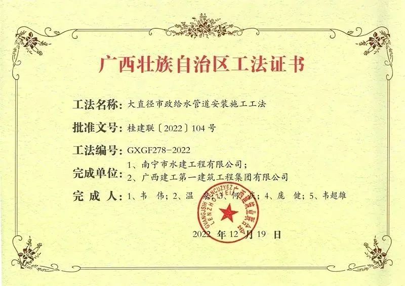 在2022年度廣西壯族自治區級工程建設工法評審活動中,由廣西綠城水務股份有限公司下屬南甯市水建工程有限公司(下簡稱“水建公司”)組織申報的《大直徑市政給水管道安裝施工工法》,經自治區級工程建設工法評審委員會評審,成功獲評爲2022年廣西壯族自治區級工程建設工法。